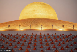La foto de los monjes orando bajo la inmensa cúpula dorada de Wat Phra Dhammakaya, durante la ceremonia anual de Makha Bucha en febrero pasado, es impresionante por su brillo etéreo. Son decenas de monjes y devotos, muchos de ellos con faroles a sus costados, reunidos para conmemorar la primera gran enseñanza de Buda.