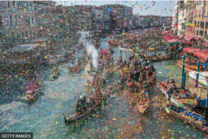 La imagen de una rata gigante de papel maché que estalla en papeles de colores, flotando por el Gran Canal de Venecia, durante el desfile acuático que tradicionalmente inaugura el carnaval de febrero, es una explosión de color vibrante.