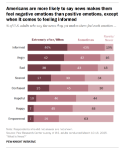 La buena noticia es que cuando Pew encuestó a las personas sobre cómo las hacen sentir las noticias, la respuesta principal fue «informadas». Sin embargo, las siguientes cuatro emociones que mencionaron son complejas: enojo, tristeza, miedo y confusión. (No puedo hablar por todos los periodistas, pero supongo que la confusión no es una emoción que muchos querríamos que la gente sintiera al ver nuestra cobertura). También sabemos que las personas dicen que emociones negativas como estas son una de las razones por las que evitan las noticias en general.