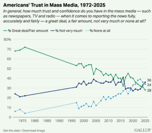 El nivel de confianza del público en las noticias alcanzó su nivel más bajo este año, según la encuesta anual de Gallup . Solo el 28 % de los encuestados afirma confiar en que los medios informan de forma completa, precisa e imparcial. Otro dato a tener en cuenta: la confianza tiende a la baja en todo el espectro político. La confianza de los republicanos en las noticias cayó a un solo dígito por primera vez (8 %), mientras que la de los independientes y los demócratas también mostró una tendencia a la baja.