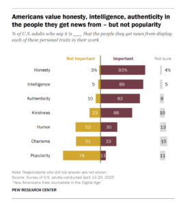 Cuando Pew preguntó a la gente cómo querían que fueran sus proveedores de noticias , la respuesta más frecuente fue honestidad, con un 93% que afirma que es importante. Ahora bien, quizá pienses: ¡Somos honestos! Pero si nuestra audiencia no lo ve ni establece esa conexión, entonces nuestra intención no importa. La realidad es que, si la gente dice que quiere honestidad, debemos asegurarnos de comunicársela regularmente a nuestra audiencia.
