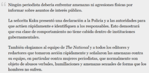 The National, diario en línea en el que Kuku trabaja, dijo que las autoridades deben disciplinar a los oficiales que funcionarios a la periodista.