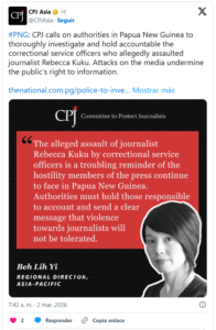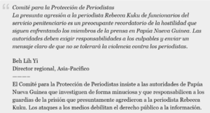 El 27 de febrero, cuando Kuku visitó la Oficina de Servicio Correccional en Port Moresby, dijo que la agredieron verbalmente, que luego la golpearon por la espalda y que los funcionarios la amenazaron por su reportaje.