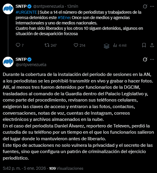 Caracas, Venezuela.- El Sindicato Nacional de Trabajadores de la Prensa (SNTP) denunció este lunes 5 de enero, que al menos 14 periodistas fueron retenidos durante su cobertura de la instalación del nuevo período de la Asamblea Nacional chavista.