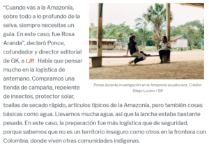 La planificación detallada fue una parte esencial del proceso de preparación para Isabela Ponce, Emilia Paz y Miño y Diego Lucero, del sitio web ecuatoriano GK. El informe publicado por el equipo , con fotos de Lucero, dice que las tres empresas que operan la zona de extracción petrolera en Ecuador han adoptado estrategias para fragmentar las comunidades locales y hacerlas dependientes de sus actividades. Sin embargo, han encontrado resistencia por parte de líderes y organizaciones indígenas. El equipo acompañó a Rosa Aranda, líder indígena de la región, en una incursión en la Amazonía ecuatoriana.