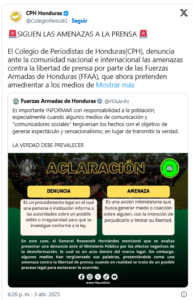 Tegucigalpa, Honduras.- El Colegio de Periodistas de Honduras (CPH) denunció este jueves ante la comunidad nacional e internacional las recientes amenazas contra la libertad de prensa por parte de las Fuerzas Armadas de Honduras (FFAA), que ahora pretenden amedrentar a los medios de comunicación.