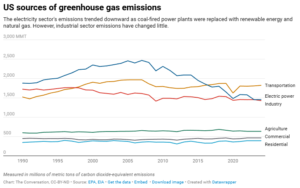 Sin embargo, las emisiones estadounidenses derivadas de muchas de las actividades que producen gases de efecto invernadero —transporte, industria, agricultura, calefacción y refrigeración de edificios— se han mantenido prácticamente iguales en los últimos 30 años. El transporte ha aumentado ligeramente; la industria, un poco. Y la electricidad, que en su momento fue la mayor fuente de emisiones de gases de efecto invernadero del país, ha experimentado una reducción significativa.
