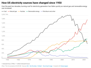 El consumo de electricidad en Estados Unidos ha aumentado últimamente debido al cambio hacia una mayor electrificación de los automóviles y los sistemas de calefacción y refrigeración, así como a la expansión de los centros de datos; sin embargo, las emisiones de gases de efecto invernadero procedentes de la electricidad se han reducido en casi un 30% desde 1995.