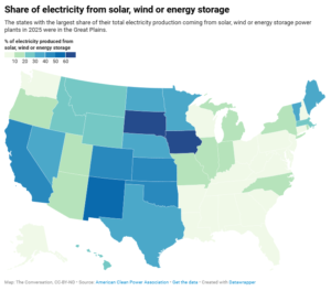 Los costos de la energía solar y eólica han disminuido tanto que ahora son más baratos que el carbón y competitivos con el gas natural. Catorce estados, incluyendo la mayor parte de las Grandes Llanuras, obtienen actualmente al menos el 30% de su energía de fuentes solares, eólicas y de almacenamiento en baterías.