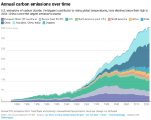 Analicemos el caso de Estados Unidos, históricamente el mayor emisor de gases de efecto invernadero del mundo . Durante esas tres décadas, la población estadounidense aumentó un 28% y la economía, medida por el producto interno bruto ajustado a la inflación, se duplicó con creces .