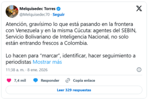 El periodista Melquisedec Torres advirtió en la red social X sobre lo que calificó como una situación “gravísima” en la ciudad de Cúcuta y en los pasos fronterizos con Venezuela. Según su denuncia, agentes del SEBIN estarían ingresando a Colombia para “marcar, identificar y hacer seguimiento” a periodistas extranjeros que han llegado desde el sábado con la intención de cubrir los acontecimientos posteriores a la captura de Nicolás Maduro.