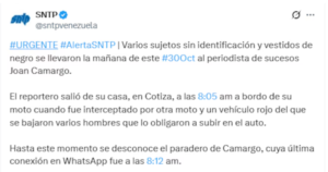 Caracas, Venezuela.- El Sindicato Nacional de Trabajadores de la Prensa (SNTP) de Venezuela denunció la desaparición del periodista Joan Camargo, quien fue interceptado por sujetos vestidos de negro la mañana de este jueves cuando salía de su residencia en la parroquia San José de Cotiza en Caracas.