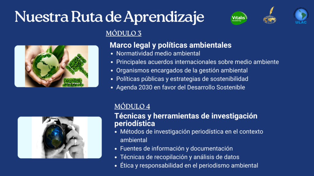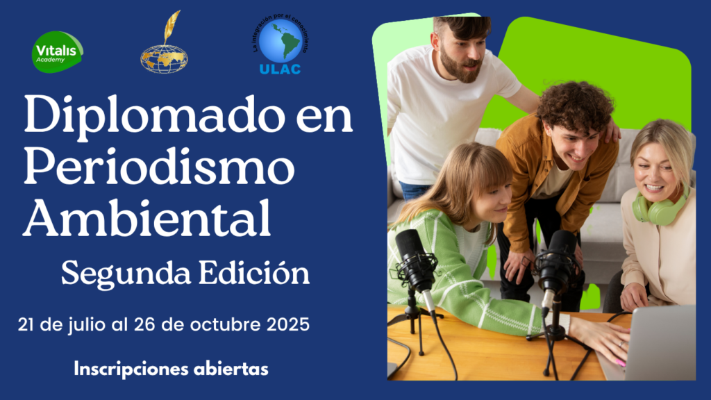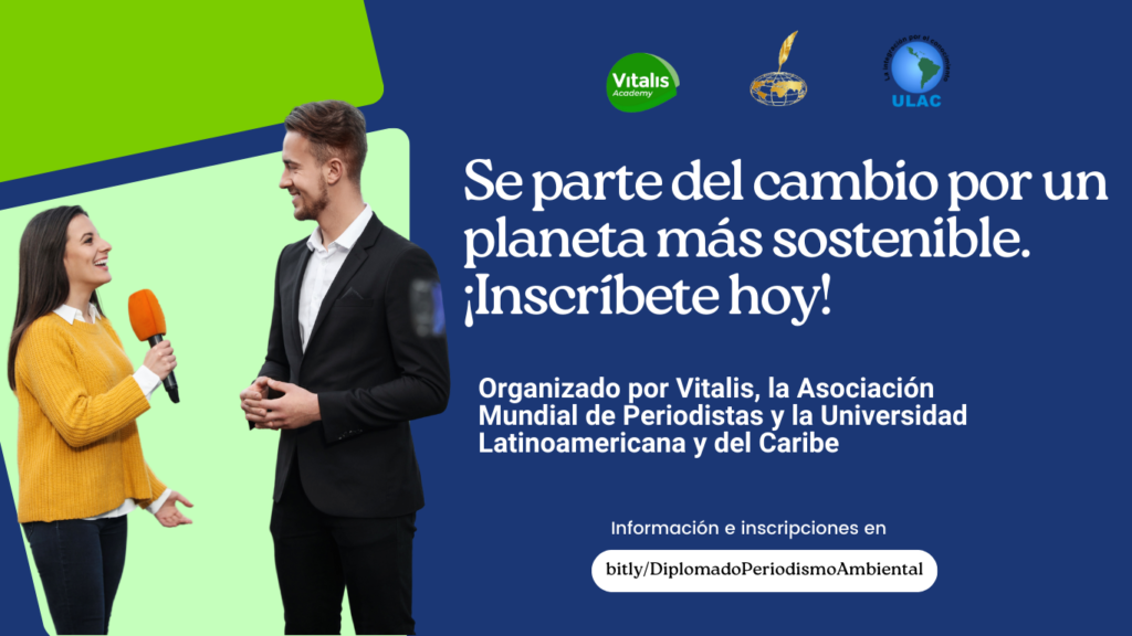 Bienvenidos al Diplomado en Periodismo Ambiental, ofrecido por la Asociación Mundial de Periodistas en alianza con Vitalis Academy, una asociación civil, sin fines de lucro, dedicada a contribuir con la formación en valores, conocimientos y conductas, cónsonas con la conservación ambiental y el desarrollo sustentable, y la Universidad Latinoamericana y del Caribe, ULAC, institución de educación superior orientada a formar profesionales a nivel de postgrado que contribuyan con el fortalecimiento de la producción científica, tecnológica y ética de la región.