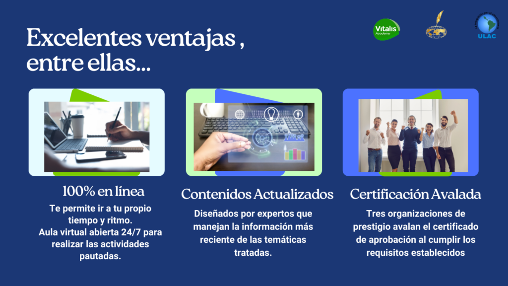 Diploma digital con logos y firmas por la Universidad Latinoamericana y del Caribe ULAC, Vitalis Academy y la Asociación Mundial de Periodistas, en anverso, con los datos de la certificación, horas académicas y código QR de verificación. En el reverso, el contenido del Diplomado y sus distintos módulos.