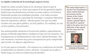 Uno de los argumentos centrales de Brotman es que el público carece de una comprensión clara de lo que hace y no hace la Primera Enmienda. «El principal conflicto, o al menos la percepción errónea, es que la Primera Enmienda es en realidad una barrera entre el gobierno y los ciudadanos de Estados Unidos», dijo. «No otorga a los ciudadanos un derecho general a la libertad de expresión ni un derecho general a la libertad de prensa, sino que protege la libertad de expresión y la libertad de prensa frente al gobierno».