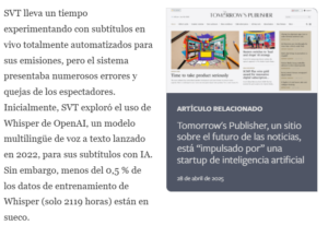 Las emisoras de noticias de televisión suecas están entrenando sus propios modelos de reconocimiento de voz para competir con OpenAI. El proyecto fue diseñado por Mikaela Åstrand , ingeniera de aprendizaje automático de SVT, la televisión pública nacional sueca, y Leonora Vesterbacka , científica de datos sénior de KBLab, la división de humanidades digitales de la Biblioteca Nacional de Suecia.