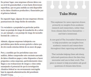 Algunas empresas, como First Street, proporcionan informes técnicos sobre sus metodologías de modelado de riesgos . Los periodistas que cubren análisis de riesgos de datos climáticos privados deberían verificar cualquier metodología proporcionada por una empresa con expertos independientes, como climatólogos académicos especializados en modelado de riesgos.