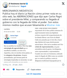 La columna no mencionó el holocausto ni vinculó a Hitler ni a su llegada al poder con Milei. Quien sí lo hizo fue un mensaje de la cuenta “El Fenómeno Barrial”, desde un usuario anónimo (@mileibarrial) que integra el ecosistema de cuentas ligadas al esquema de comunicación del Gobierno.