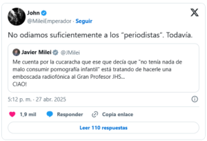 El mensaje publicado esta tarde por la cabeza del Poder Ejecutivo había sido trazado días atrás desde la cuenta en la red social X que se adjudica al asesor presidencial Santiago Caputo. “No odiamos suficientemente a los “periodistas”. Todavía», escribió el domingo por la tarde el usuario @MileiEmperador, asociado a Caputo y que en esa red social anticipa la directriz que luego repiten y amplifican militantes, funcionarios y cuentas anónimas libertarias. Esta vez, también el Presidente.