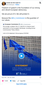 Estados Unidos de América (EE.UU.) impuso estas sanciones el martes, afirmando que estas cinco figuras europeas apuntadas promueven la «censura» y, por tanto, restricciones a la libertad de expresión y a los contenidos estadounidenses en las redes sociales.