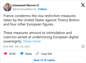 El presidente francés, Emmanuel Macron, también afirmó que «Francia condena las decisiones estadounidenses de imponer restricciones de visados» porque «constituyen una intimidación y una coerción contra la soberanía digital europea».