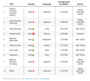 Todos los demás periódicos incluidos en la clasificación de los diez periódicos más importantes del mundo de Press Gazette son de India o Japón.