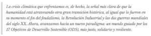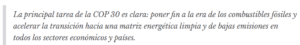- Promover una transición justa y acelerada de los combustibles fósiles a las energías sostenibles, reorganizando las bases productivas para que las economías bajas en carbono se conviertan en la norma —en lugar de la excepción— en todas las regiones del planeta.