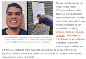 Esta experiencia fue fruto de la participación de Mora en Contar Fronteras , una iniciativa de formación y edición organizada por los medios independientes La Vida de Nos, El Bus TV y Runrun.es. Como parte del programa, 16 jóvenes periodistas de los estados fronterizos de Apure, Bolívar, Táchira y Zulia aprendieron a informar sobre temas locales con un enfoque en el servicio y los derechos humanos. También aprendieron a distribuir historias en diferentes formatos, tanto digitales como presenciales, como lo hizo Mora en Táchira.