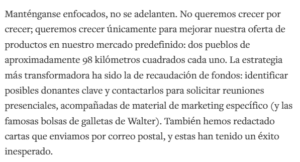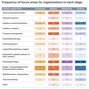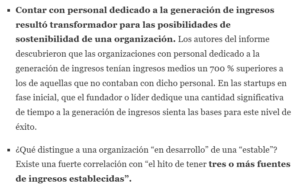 El informe examinó cómo las organizaciones en diferentes etapas de crecimiento utilizaron hasta 20.000 dólares en fondos proporcionados para implementar recomendaciones, y descubrió que “en todas las etapas de la organización, la asistencia con la planificación y la estrategia fue el uso más común o el segundo más común” de estos fondos.