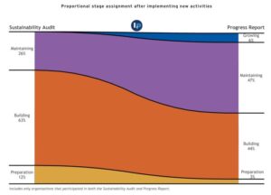 De las 98 organizaciones que participaron tanto en la auditoría de sostenibilidad como en el informe de seguimiento del progreso, el 45% avanzó a la siguiente etapa de crecimiento y otro 32% progresó en uno de los tres pilares de la sostenibilidad.