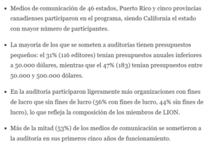 Según LION, entre la auditoría y el seguimiento realizado un año después, la organización implementó medidas sustanciales, como ofrecer seguro médico, crear un manual para empleados, desarrollar un plan a uno o tres años, contratar un seguro de responsabilidad civil para medios de comunicación y, con fondos del programa, definir, monitorear y utilizar datos de impacto. Durante este período, el medio de comunicación incrementó sus ingresos de 20 000 a 138 764 dólares.