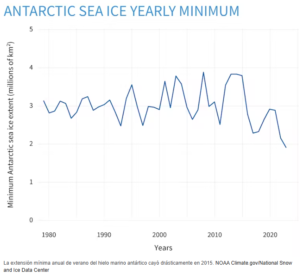 La pérdida del hielo marino antártico tiene consecuencias globales. Menos hielo marino implica menos hábitat para los pingüinos y otras especies que viven en el hielo. Una mayor cantidad del calor almacenado en el océano se libera a la atmósfera cuando el hielo se derrite, lo que aumenta el número e intensidad de las tormentas y acelera el calentamiento global. Esto provoca olas de calor en tierra y derrite aún más la capa de hielo antártica, lo que eleva el nivel del mar a nivel mundial.