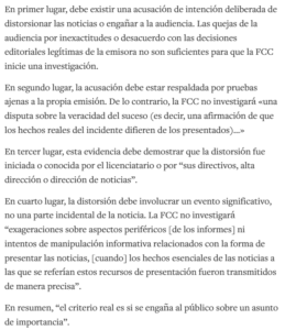 ¿Qué es , entonces , la política de distorsión informativa? Para una perspectiva irónica, consulte este artículo de 2019 de Joel Timmer, de la Universidad Cristiana de Texas, que expone su historia. Timmer, con gran perspicacia, cita la política de distorsión informativa —que data de 1949, una época bastante distinta para los medios de comunicación— como una herramienta que una FCC pro-Trump podría usar para atacar a sus supuestos enemigos en la prensa. No se trata de una regulación, sino de una política general que evolucionó «a través del proceso de adjudicación en las decisiones que resolvían impugnaciones a las licencias de las emisoras». Citando un trabajo anterior de Chad Raphael , explica en qué consiste esa definición evolucionada de «distorsión informativa»: