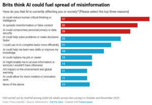 Cuando se les pidió que nombraran tres formas en las que la IA está afectando “a usted o a la sociedad”, las respuestas más populares fueron que podría reducir “el pensamiento crítico o la inteligencia humana” y ayudar a “difundir información errónea o contenido falso”.