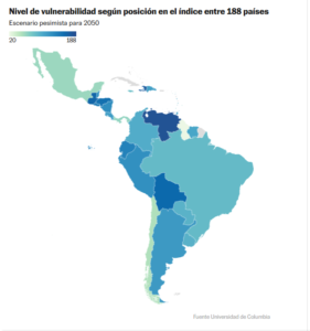 El informe realizado por Columbia destaca que Guatemala, El Salvador y Honduras figuran reiterativamente como países vulnerables en los cuatro escenarios, y que solo 13 a lo largo de América Latina y el Caribe tienen un riesgo entre bajo y medio en el escenario optimista de 2050: Guyana, siendo el país número 22 con mejor puntaje, por encima de Chile (51), México (60) y Panamá (64). Otros países de Sudamérica, como Brasil (88), Colombia (100) y Argentina (117), están más cerca de la zona de riesgo medio en el ranking global bajo ese escenario entusiasta a mediano plazo.