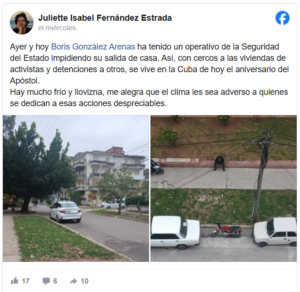 Este miércoles también fueron impedidos de salir de su vivienda el periodista Boris González y los activistas Berta Soler y Ángel Moya. “Ayer y hoy [27 y 28 de enero] Boris González Arenas ha tenido un operativo de la Seguridad del Estado impidiendo su salida de casa. Así, con cercos a las viviendas de activistas y detenciones a otros, se vive en la Cuba de hoy el aniversario del Apóstol”, denunció en Facebook la esposa del periodista, Juliette Isabel Fernández Estrada.